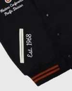 - PATCHES OF EMBROIDERED CHENILLE ON THE LEFT AND RIGHT HEMBODS, THE RIGHT SLEEVE, AND THE BACK